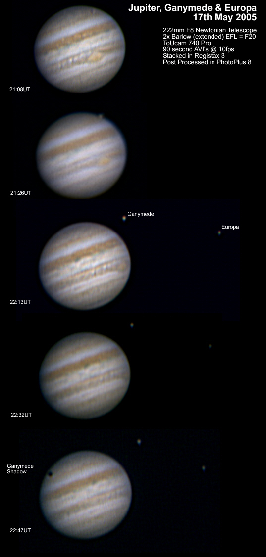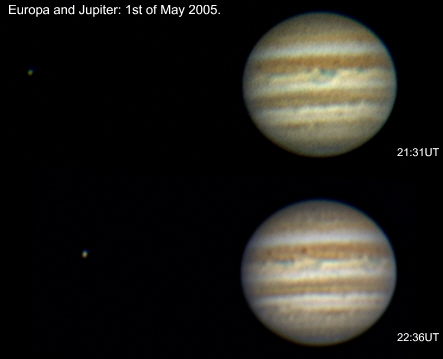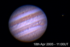 May 1st 2005 The seeing on this night was pretty good for my location. There is an interesting feature in the centre of the disc at 21:31UT. A double festoon feeding into the equatorial band. |