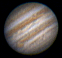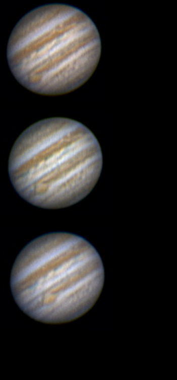 Above is a small animation of the three images opposite. The animation shows how the seeing has worsened during the imaging session. The advantage of an animation is that is confirms whether features are real or just noise. True features will move with the rotation of the planet, noise or processing artifacts will not. |