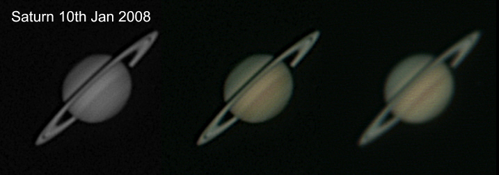 10th January 2008 My first decent image of Saturn this year. Very noticeable is how much the rings have tightened up since last year. Another year and they will be almost completely closed into a thin line. The mono image is taken with a black and white CCD toucam and a 685nm IR pass filter, effectively passing wavelengths from 1000nm to 685nm. The colour image on the right is a standard RGB ToUcam and the centre image is the IR mono image colourised with the RGB image. |