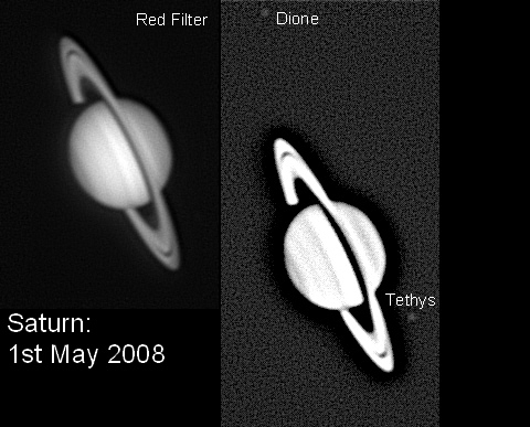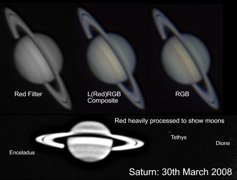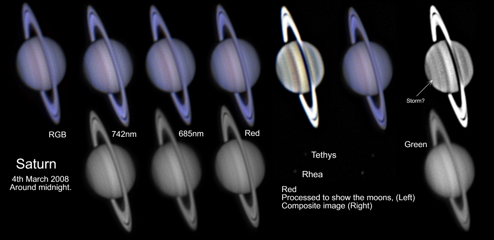 9th March 2008. (below) Another good nights imaging, though I used less filters due to the less transparent skies making the Saturn image rather faint. The red filter seems to bring out the banding in the southern hemisphere nicely and ironically, given my comment for the 4th of march the equatorial band is more prominent in the red filtered image than the 685nm image. Over processing brought out some of the moons that were otherwise hidden in the image. |