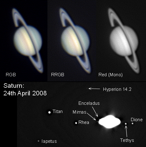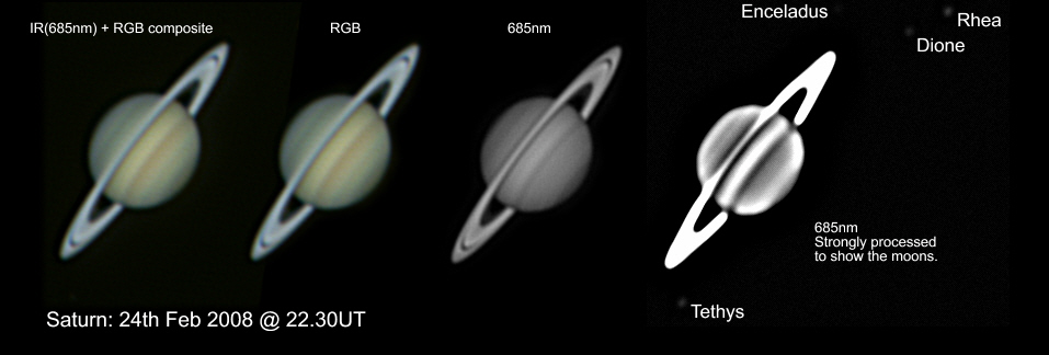 | 24th February 2008. I caught Saturn less than 24 hours after opposition this year. The opposition effect on the rigs is quite marked. It is a similar effect to the full moon, where the rings (or the moon) are brighter than you would expect, when they are opposite the sun in the sky and reflecting light almost directly back to us. In the image below, the ring brightness when compared to the planets brightness is markedly greater than at other times. I also over processed the IR image to bring out the moons that are otherwise invisible in the image - far right image |