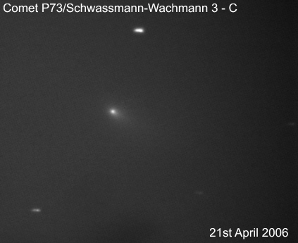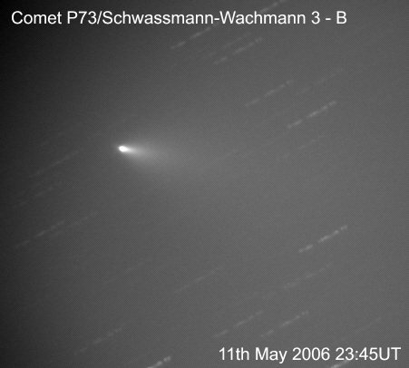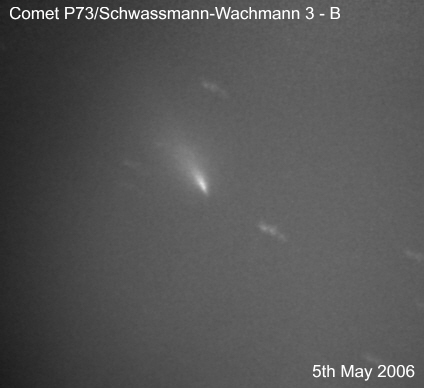 11th May 2006 This is a stack of 45 x 8s images through my 6" F6 relector - focal reduced to F4. I was going to try an image at F6 but the clouds rollen in over that part of the sky. I imaged Jupiter instead, and I was glad I did... Click here for Jupiter. This is probably the last of my images of this comet, bad weather is forcast for the next few days - and it is rapidly becoming a morning object, a time of day when I am useless ;o) |