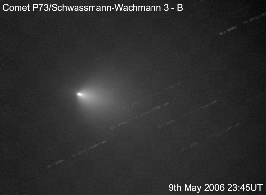 Comet 73P Schwassmann-Wachmann was discovered in the 1930's. It is quite a faint comet and on several of it's returns it has been missed altogether. In 1995 the comet was seen to fragment and has traveled through it's orbit in several pieces since then. In it's 2006 return it comes very close to earth. As a result it is brighter than normal. These are my attempts to image the comet through my 6" F6 reflector (focally reduced to F4). The images are stacks of about 50 x 10s images each using a Long Exposure (LX) modified Vesta webcam with a Black & White replacement CCD. The comet is relatively small and faint and I image from a very light polluted area... well that's my excuse and I'm sticking to it ;o). On April the 21st (ish) Comet fragment B was seen to split and I was pleased to capture this in the image below on the 24th. Roll over the image on the left to see a labelled version of the image. The Image to the right is from the ESO Very Large Telescope in Chile and shows much more detail in the split nucleus of the comet. Click the ESO image to go to the ESO site. |